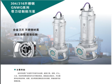 304.316不銹鋼GNWQ系列帶刀切割排污泵。葉輪具有獨(dú)特的螺旋式結(jié)構(gòu)及帶鋒利刀口設(shè)計(jì),在保證永利性能的高效且超過(guò)同類產(chǎn)品的同時(shí),兼具卓越的切割能力,能夠保證稻草,棉,布等廢棄物切碎后完全排出,不堵塞。